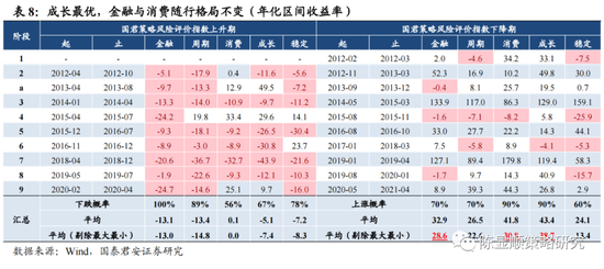 风格复盘:1)大小风格方面,中盘继续占优。在国君策略风险评价指数下行期,大盘与中盘上涨概率相同,但从平均年化收益率(剔除最大最下值)来看,中盘(28.6%)较大盘(25.7%)更优。2)大类行业风格方面,成长最优,金融与消费紧随的格局没有发生变化。从平均年化收益率(剔除最大最下值)来看,成长(38.7%)最优,金融(28.6%)与消费(30.8%)紧随其后。周期(22.6%)与稳定(13.4%)表现仍靠后。