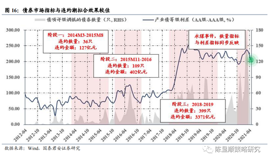 由于债券市场兼具对利率与信用的高敏感度,往往先于权益市场对风险进行定价。2020M11永煤、华晨等AAA级国企信用债违约再度冲击“刚兑信仰”,令市场的风险评价迅速上行。事实上自2014年以来,我国共经历三次明显的违约潮[1],我们采用“产业债等级利差(AA级-AAA级)”[2],辅以“债项评级调低的债券数量”与“主体评级调低的企业数量”,能够较好地反映对市场风险评价的影响。