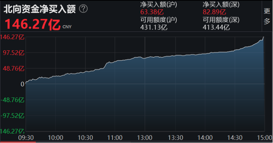 根据wind数据显示,14:57分时,北向资金净流入额停留在135.48亿元,收盘后净流入额为146.27亿元,3分钟时间北向资金“涌入”10.79亿元。如果将挂单未成交量统计在内,盘中一度“净流入”达371亿元。