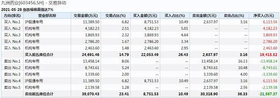 盘后龙虎榜数据显示,今日机构专用席位在九洲药业上拼杀得极为惨烈,前买5和前卖5席位中均出现4个机构专用席位,并且一个沪股通专用席位也来回倒手。数据显示,沪股通专用席位在买入8751万元的同时卖出2637万元,净买入超过6100万元。4个机构专用席位累计净买入1.33亿元,而另4个机构专用席位累计净卖出高达2.77亿元。