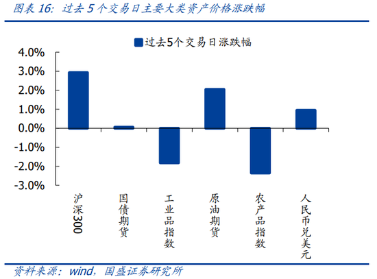 大宗商品方面,截止至周四,国内原油期货上涨2.04%;工农业产品走势同步,工业品下跌1.82%,农业品下跌2.35%;过去5个交易日NYMEX原油上涨8.14%,收于66.86美元/桶,伦敦黄金现价上涨1.03%,收于1896.3美元/盎司。
