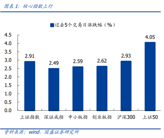 过去5个交易日A股上行。截止至周四(5月27日)收盘,沪指收于3608.85点。市场核心指数上行。上证50、沪深300、上证指数、创业板指、中小板指、深证成指分别上行4.05%、2.93%、2.91%、2.62%、2.59%、2.49%。申万一级行业多数上涨,食品饮料、休闲服务和计算机领涨,农林牧渔、电气设备和汽车领跌。成交占比方面,金融占比上升,周期、消费和成长占比相应下降。