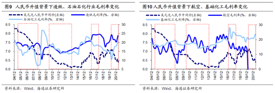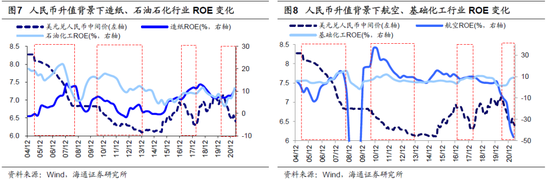 人民币汇率变化对行业基本面有影响但不改变大趋势。目前全球大宗商品均是以美元作为计价单位,人民币升值就意味着我国进口大宗商品的价格相对下降,这将直接让航空、石油化工、造纸、基础化工等行业的进口原材料成本下降,从而有助于降低成本、增厚利润。比如2005/07-2008/05人民币升值期间,这些行业毛利率和ROE大幅改善,具体而言:造纸ROE(TTM,整体法,下同) 从05Q2的-0.2%升至08Q2的12.1%,石油化工维持在20%左右的高位,航空从-4.6%升至12.3%,基础化工从6.2%升至14.7%。但是,拉长周期看,行业基本面是由景气周期决定的,人民币汇率升值不改变这一大趋势。比如2010/5-2013/12人民币升值期间,这些行业毛利率和ROE反而下行,具体而言:造纸ROE从10Q2的7.5%降至13Q4的0.7%,石油化工从15.5%降至11.3%,航空从20.1%降至7.2%,基础化工从6.6%降至4.6%。过去1年多以来的人民币升值有助缓解原材料成本压力,增厚企业利润,具体而言:造纸ROE从20Q2的7.1%升至21Q1的10.9%,石油化工从3.3%升至11.3%,基础化工从1.6%升至9.1%。但是航空除外,这是因为疫情蔓延使得人口流动受限,导致航空业迟迟未能恢复景气,从而业绩仍未能大幅改善。