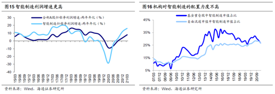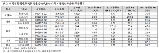 智能制造有望成为新主线。五月初以来一直强调,周期股的表现可能暂时告一段落,往后看我们对大势保持乐观,而板块中智能制造有望贡献显著的超额收益。重视智能制造逻辑有三:第一,智能制造基本面更强。5G和新能源等技术逐渐应用,推动智能制造业绩增长;疫情导致全球制造业产业链重构,中国制造乘势升级;温和通胀阶段,制造业盈利扩张。第二,政策支持智能制造快速崛起。十四五规划重在构建现代产业体系,4月工信部起草的《“十四五”智能制造发展规划》(征求意见稿)提出加快推动智能制造发展。5月28日两院院士大会在北京举行,习近平出席并发表重要讲话,强调“要加强原创性、引领性科技攻关,坚决打赢关键核心技术攻坚战”,科技创新将推动智能制造发展。第三,基金为代表的机构对智能制造配置不高。21Q1基金重仓股中智能制造类行业占比仅26.6%,而20Q2的高点为32.3%,目前仍略微低配。详见前期报告《疫情加快中国制造升级——中国智造系列1-20210319》、《中国智造正走向世界前列——中国智造系列2-20210402》、《从科技时钟看智能制造前景——中国智造系列3-20210414》、《温和通胀利于制造业盈利扩张——中国智造系列4-20210429》、《中国智造:智勇兼备,造就未来-20210511》、《智能制造的重点子领域——中国智造系列5-20210528》。沿着“中国智能制造”的主线,海通策略联合行业梳理了智能制造相关领域投资机会,具体标的详见表2。