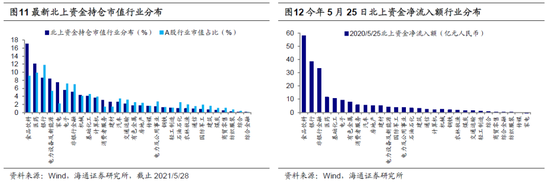 北上资金整体偏好消费及茅指数代表的优质龙头。截止2021/5/28,北上资金持股市值规模总计达到2.6万亿元,其中市值占比较大且超配的行业主要是消费、医药、新能源等,具体而言:北上资金持仓/全部A股中食品饮料市值占比为17.0%/9.1%,医药为12.1%/9.9%,银行为8.5%/11.8%,电力设备及新能源为8.3%/5.4%,家电为7.4%/2.3%,可见外资对长期优质赛道的偏好更强烈。5月25日当天美元兑人民币汇率突破6.4,当日上证指数大涨2.40%,沪深300大涨3.16%,全天北上资金净流入217亿元,主要流向食品饮料行业59亿元,银行39亿元,非银行金融33亿元,医药11亿元,基本反映了北上资金的配置偏好。更进一步看,在北上资金持仓中,茅指数成分股的公司市值规模达到1.26万亿元,占全部北上资金的47.7%,而这41只茅指数成分股总市值为19.7万亿元,占全部A股的22.1%,可见北上资金明显超配了茅指数代表的各行业优质龙头。