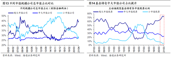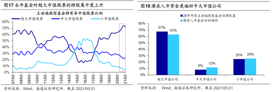操作上,守正出奇。根据总市值,当前A股分三层:800亿以上/200-800亿/200亿以下,数量占比4%/13%/83%,市值占比44%/27%/29%。第一梯队以茅指数为代表,是各个行业的优质龙头,配置价值仍较好,守正。从盈利估值比、新基金配置偏好看,今年第二梯队的中大盘性价比更优,出奇。春节后茅指数大幅下跌引发了部分投资者对今年市值风格的担忧,而我们认为,2017年以来超大市值(总市值800亿以上)个股表现占优,源于经济转型期龙头业绩更优+机构化加速带来龙头估值溢价,去年疫情冲击基本面+天量基金发行加速了这一趋势。这些趋势性的因素至今没有改变,春节以来代表超大市值的茅指数跑输,只是性价比的自我修正。随着疫情得到控制,后疫情时代经济逐渐步入正轨,以茅指数为代表的超大盘股在基本面上的相对优势不会像去年那么极致,我们测算超大市值公司21Q1归母净利润两年年化增速为15%,当前PE(TTM,整体法,下同)为29倍,中大市值(总市值200-800亿)分别为19%、27倍,小市值(200亿以下)为6%、49倍,中大市值个股业绩改善较为明显。此外,我们测算了潜在入市基金的市值偏好,目前全市场所有主动偏股型基金、潜在入市基金对于总市值800亿元以上超大公司的配置力度分别为67%/63%,200-800亿元中大公司为8%/12%,200亿元以下公司为25%/26%,中大市值公司更受到资金偏好,详见《茅指数忧虑的出路-20210426》。