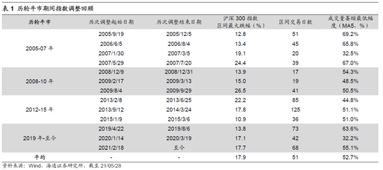 人民币升值助力牛市重建。今年以来5个月,市场整体呈现区间震荡的格局,春节是个分水岭。我们一直提出今年延续19年1月开始的牛市,春节后的调整是牛市中的回撤,近期报告《市场在重建中-20210505》、《向阳而生-20210523》中,我们分析指出,今年企业盈利回升趋势不变、市场估值矛盾不大,牛市格局不变,经历春节以来的调整后,市场正在慢慢恢复元气,处在重建之中。春节后市场调整的主要利空是担忧通胀,担忧货币政策收紧,从经济周期、基本面角度分析,今年真实的通胀压力不大,月度数据将冲高回落,近期人民币升值有助于缓解原材料成本的压力,且吸引外资流入,有助牛市重建。我们认为今年投资时钟处于过热期,股市的整体背景是微观盈利增长>宏观流动性略收紧,股市延续上涨态势,明年投资时钟有可能进入滞胀期。基本面上,虽然企业利润单季度同比高点在21Q1,但是剔除低基数影响后,本轮盈利周期真正盈利高点在21Q4或22Q1,预计全年A股净利同比增速为20%。宏观流动性上,今年较去年边际趋紧,但是只是温和状态,2018年、19年、20年十年期国债收益率均值为3.64%/3.20%/2.98%,21年初至今均值仅为3.2%。从盘面上看,过去每轮牛市中都有3-4次耗时2个月以上、跌幅15%附近的大调整。本轮调整从2月18日至今历时68个交易日、最大跌幅17.7%(以沪深300刻画),成交量(MA5)最低萎缩至前期高点的55%,从时间和空间上看这次调整已经较为充分了。