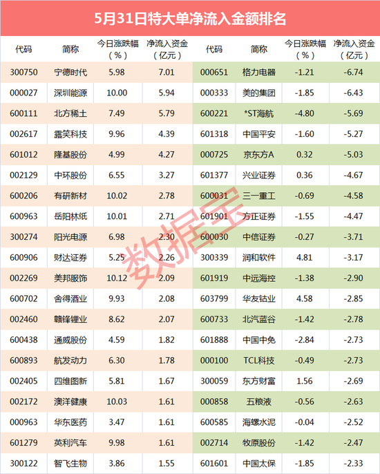 个股来看,两市有13只股票获特大单净流入超2亿元。宁德时代特大单资金净流入居首,为7.01亿元。紧随其后是深圳能源和北方稀土,特大单资金净流入分别为5.94亿元和5.79亿元。