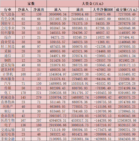 从资金层面看,周一,A股大单资金整体净流出163.45亿元,其中,有1598只个股呈现资金净流入,2638只个股呈现资金净流出。从申万一级的28个行业来看,有6个行业呈现资金净流入态势,其中,电气设备、有色金属等两个行业资金净流入均超10亿元,分别为27.70亿元和15.47亿元。另外,22个行业均呈现资金净流出态势,其中,非银金融和家用电器等行业资金净流出均超20亿元。