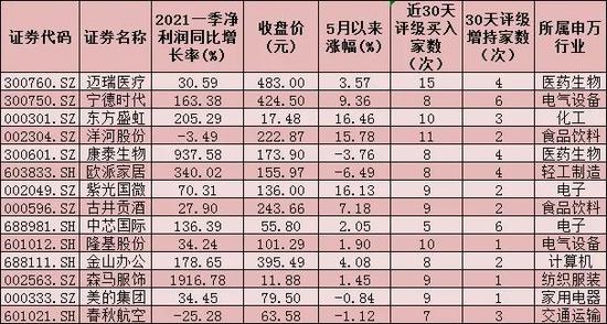 从市场表现来看,5月份以来,在上述112只个股中,有46只个股跑赢同期上证指数,占比逾四成。其中,东鹏饮料、长安汽车、谱尼测试、航发动力、兴发集团、天赐材料、晶澳科技、新益昌等8只个股,期间累计涨幅均超30%,尽显强势。