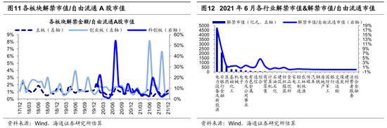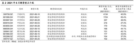 21年6月电力设备及新能源、非银金融、医药等行业解禁金额最大。按照21年5月31日的股价估算:6月电力设备及新能源、非银金融、医药等行业解禁金额最大,解禁金额分别为4696、2094、649亿元,解禁市值/自由流通市值分别为17.9%、8.6%、1.6%。从个股来看,21年6月宁德时代、中信建投解禁规模最大,解禁金额分别为4134、1724亿元,解禁市值/自由流通市值分别为40.9%、65.4%。