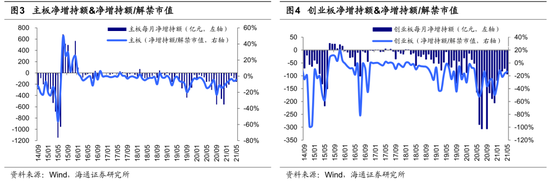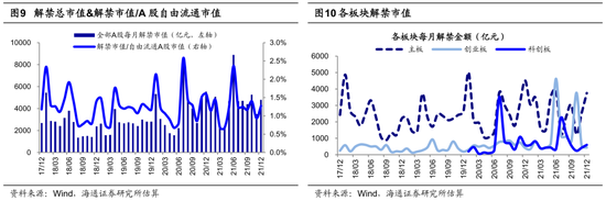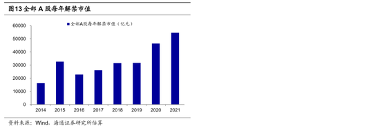 21年6月A股解禁市值约为8890亿元,高于21年5月的4664亿元,21年月均解禁4553亿元。我们按照2021/5/31的股价估算,21年月均解禁4553亿元,20年月均3862亿元。21年6月解禁市值/自由流通A股市值为2.4%,2017年以来该比值均值为1.2%;21年6月解禁市值/成交金额为5.6%,2017年以来该比值均值为2.7%,从自由流通市值角度21年6月解禁相对规模高于2017年以来平均水平。从板块看,21年6月主板、创业板、科创板解禁金额分别为3931、4622、337亿元,解禁金额/自由流通A股市值分别为1.3%、8.1%、3.0%,可见创业板解禁的相对规模最大。对全部A股每年解禁市值进行统计, 21年/20年/19年/18年全部A股解禁市值分别为54637亿元、46348亿元、31510亿元和31376亿元。