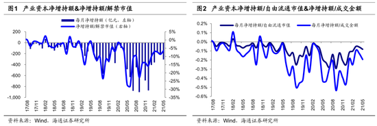 21年5月产业资本二级市场净减持306亿元,21年4月净减持204亿元,17年6月(减持新规实施)以来月均净减持232亿元。2017年5月27日,证监会发布《上市公司股东、董监高减持股份的若干规定》(以下简称减持新规),上交所、深交所也分别发布了相关实施细则,我们研究减持新规实施以来的增减持情况:截止2021年5月31日,从绝对规模看,21年5月产业资本二级市场净减持306亿元,而21年4月净减持204亿元,2017年6月以来产业资本月均净减持232亿元。从相对规模看,21年5月产业资本净增减持额/解禁市值为-6.6%,2017年6月以来均值为-7.2%;净增减持额/自由流通市值为-0.08%,2017年6月以来均值为-0.09%。