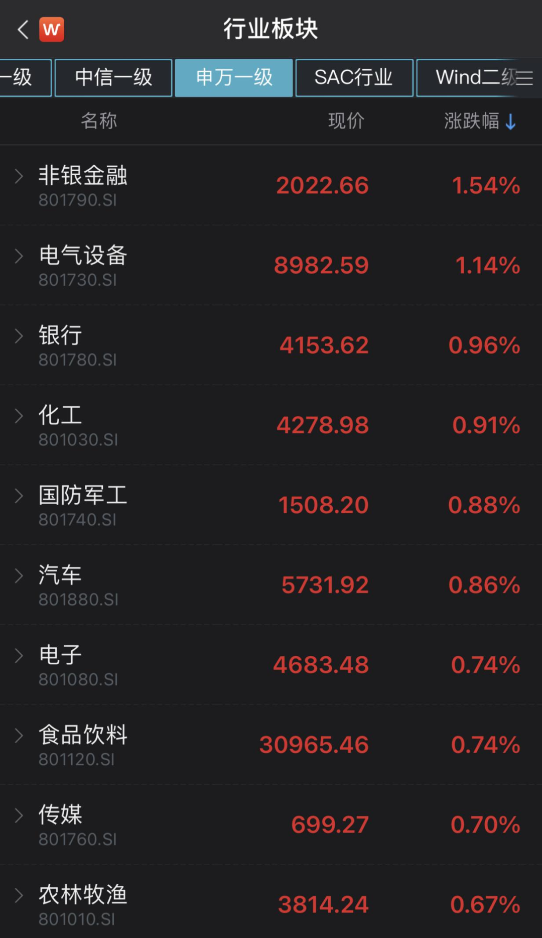 截至午间收盘,申万一级行业指数中,非银金融、电气设备、银行、化工等板块涨幅居前,采掘、休闲服务、钢铁、纺织服装等跌幅居前。