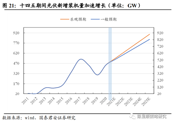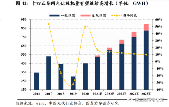 2020年12月12日,国家主席习近平在气候雄心峰会上通过视频发表题为《继往开来,开启全球应对气候变化新征程》的重要讲话,宣布中国国家自主贡献一系列新举措。首次明确风电、太阳能“碳达峰”贡献度:到2030年,风电、太阳能发电总装机容量将达到12亿千瓦以上。用2030 年装机1200GW倒推,目前装机量已经达到440GW,因此未来10年年均风电光伏装机约75GW。我们认为1200GW应是底线目标最终实际装机大概率能够超过底线目标。根据IEARenewables 2020的预测,到2025年可再生能源在新增发电装机中占比将达到95%,而光伏在所有可再生能源新增装机中占比将达到60%。根据中国光伏行业协会的乐观预测,十四五期间我国光伏年均新增装机规模是90GW。