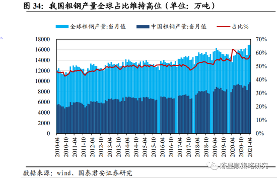 钢铁行业节能减排空间巨大。钢铁行业作为能源消耗高密集型行业,在制造业31个门类中碳排放量最大,在碳达峰、碳中和的明确规划下,钢铁行业是高耗能行业中节能减排的重点。2020年我国粗钢产量达10.53亿吨,同比增长5.2%,而全球粗钢产量为18.64亿吨,同比下降0.9%,我国占比达56.5%。从月度数据看,我国粗钢产量及全球占比均呈趋势抬升态势,从钢铁行业单位能耗看,2020年同比下降1.18%,相较产量增速,我国钢铁行业碳排放总量仍在增长。