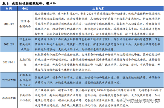 ? 中国是推动碳中和的行动派和实干家。按照我国碳中和目标,二氧化碳排放力争于2030年前达到峰值,努力争取2060年前实现碳中和。2020年四季度以来,中央经济工作会议、五中全会等重要会议强调碳中和任务,后续重磅政策有望继续出台。2021年是“2030年前碳排放达峰行动方案”制定年,各地方政府也纷纷发布了碳达峰、碳中和行动计划。