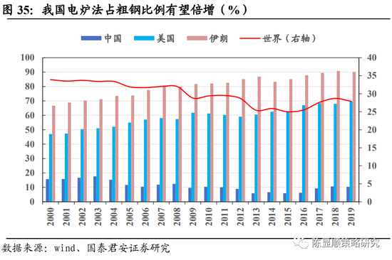 十四五期间我国电炉法占比有望翻倍。粗钢是钢铁行业的核心生产环节,目前粗钢生产工艺主要有三种,高炉-转炉法、直接还原铁-电弧炉法和利用废钢的电弧炉冶炼法。不同技术工艺的能源消耗结构不同,高炉-转炉法工艺消耗大量煤炭资源,而后两种技术路线的煤炭消耗量远小于高炉-转炉法,其中基于废钢的电弧炉工艺主要消耗电力能源。根据国际钢铁协会数据,我国电炉法占粗钢生产的比重明显低于世界平均水平,2019年我国电炉法炼钢产量为1.03亿吨,占比为10.4%,而世界平均水平为28%,更显著低于美国70%、伊朗90%的占比。2019年,工信部印发《关于引导电弧炉短流程炼钢发展的指导意见(征求意见稿)》,其中提到“十四五”发展期间,全国钢铁工业废钢比要达到30%,电炉钢比例要提升至20%。
