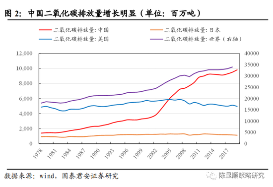 我国碳减排任务艰巨。从改革开放开始,中国经济逐步进入快速增长阶段,而经济增长必然伴随着对能源的消耗,尤其是加入世界贸易组织后,中国成为全球制造工厂,在全球产业链中处于核心枢纽地位,衔接上游资源和下游消费需求。从碳排放的节奏看,2000年起中国碳排放量显著增加,而与此同时,美国、日本等发达国家因为经济已经实现工业化,碳排放量反倒出现小幅回落。在转变经济发展方式,产业向高附加值升级,推动高质量发展的政策导向下,我国对节能减排、绿色发展的重视度明显提升。
