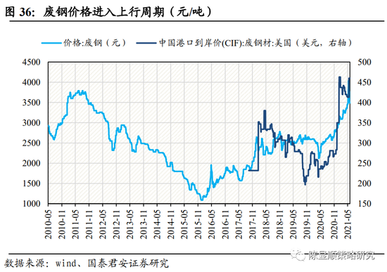 电炉炼钢占比提升,将带动废钢、石墨电极需求量大增。在市场密切关注钢铁价格的同时,废钢价格已经悄然大幅上涨,2020年3月以来国内废钢价格涨幅逾800元,从2500元/吨涨至3300元/吨,全国大部分地区出现供不应求的状态。废钢的涨价一方面源于铁矿石价格大涨增加钢厂原材料成本,出现电炉炼钢利润反超高炉炼钢的现象,钢厂废钢需求量大幅增加,但国内废钢供应增量缓慢,海外进口量极少,造成废钢供不应求价格大涨,另一方面从长期角度看,高炉炼钢吨钢碳排放量是电炉炼钢的两倍多,在碳中和政策趋严下,电炉钢占比有望持续提升,带动废钢需求。按照上述逻辑,我国亟需完善废钢的循环利用体系,同时适度增加废钢进口量。