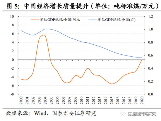 我国可再生能源占比快速提升。随着东中西部产业分化的形成和城镇化率的提升,我国一线等核心城市率先实现产业升级,北京、天津、山西、山东、海南、重庆、云南、甘肃、新疆等9省(区、市)提出了明确的碳排放达峰目标。国家已开展了三批共计87个低碳省市试点,共有82个试点省市研究提出达峰目标,其中提出在2020年和2025年前达峰的各有18个和42个。从全国范围看,近年来我国可再生能源占比不断提升,尤其是2010年以来,水电、核电、风电等可再生能源在能源生产总量中的占比快速提升,从不到10%提升到2020年接近20%,可见在此期间,我国清洁能源发展进入快车道。从单位GDP能耗角度看,2014年同比增速达到阶段高点后一路下行,长期维持负增长,单位GDP能耗趋势下行,体现出我国已经逐步扭转粗放式高耗能增长方式,正在转型为环境友好型高质量发展。
