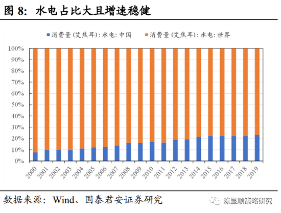 我国清洁能源发展走在世界前列,但仍有很大提升空间。从全球清洁能源发展历史看,中国底子薄、起步晚,传统化石能源占比高,经济发展不平衡的问题显著,中西部地区发展清洁能源的资金来源少,产业转型的阻力大。在国家的有效引导下,我国核能、水电等清洁能源的发展快于全球整体节奏,消费量的全球占比不断提升,尤其是水电消费量在全球总消费量中占较大比重,核电消费量的占比小但占比增速快。