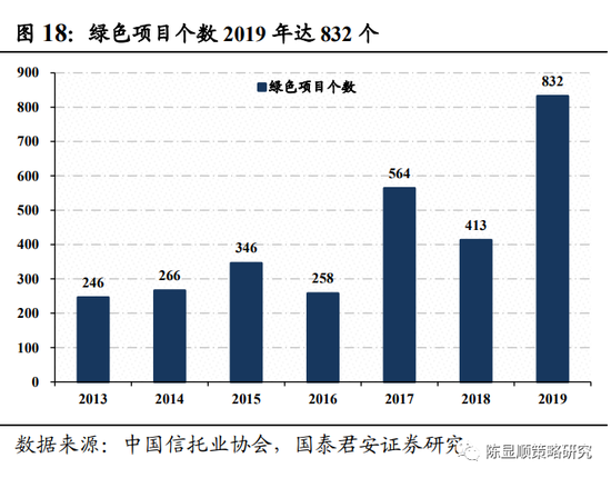绿色信托同样也是资本市场对于碳中和支持的一项重要组成部分,近年来规模正不断扩容。绿色信托是指信托公司为支持环境改善、应对气候变化和资源节约高效利用等活动,通过绿色信托贷款、绿色股权投资、绿色资产证券化、绿色产业基金、绿色(慈善)信托等方式提供的信托产品及受托服务。从中国信托行业协会社会责任报告所提供的数据来看,2013-2019年绿色信托规模由468.83亿元上升至3354.6亿元,其中2019年规模由1326.23亿元上升至3354.6亿元,同比增幅为152.94%,而从项目数量的角度来看,绿色信托存续项目数量由2013年的246个增长至2019年末的832个,其中2019年同比增长101.45%,数据上的高增长体现出了绿色信托行业的迅猛发展。