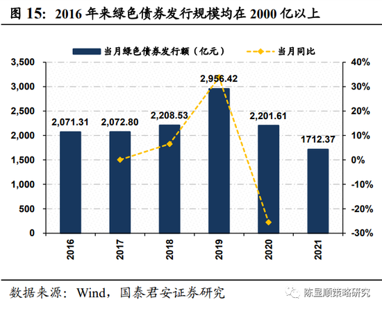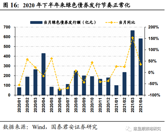 从绿色债券的发行规模上来看,2020年发行减缓主要受到疫情冲击,预计2021年发行规模将超过2019年。2016-2020年我国每年发行的绿色债券规模均在2000亿元以上,其中2019年发行规模达到2956.42亿元,当年同比增长33.86%,而2020年发行规模为2201.61亿元,同比反而下滑25.53%,主要受到疫情因素的冲击,部分项目未开工所致。具体拆分到月份数据来看,2020年下半年绿色债券的发行额度基本回归正常单月150-200亿左右,2021年开年来绿色债券的发行额单月同比均维持增长25%左右,随着碳中和政策的逐步加码,预计2021年的绿色债券发行额度将超越2019年创出历史新高。