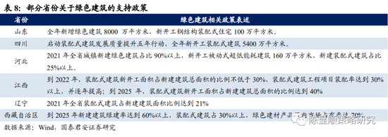 各地政策加持下绿色建筑将在未来五年内实现迅速的发展。针对住建部印发的绿色建筑创建行动方案,各省结合自身条件均提出了具体的目标,使得目标得到进一步细化和落地,其中山东省明确提出“2020年全年新增绿色建筑8000 万平方米,新开工钢结构装配式住宅100 万平方米”,四川省提出“启动装配式建筑发展质量提升五年行动,2020年全年新开工装配式建筑5400 万平方米”。
