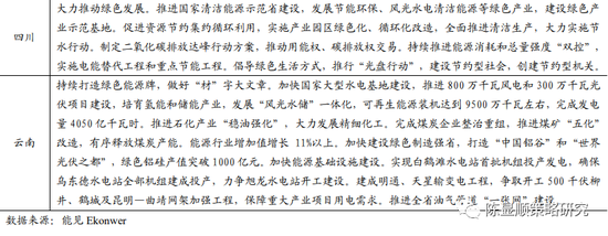 2021年是“2030年前碳排放达峰行动方案”制定年,各地方政府也纷纷发布了碳达峰、碳中和行动计划。我们尤为关注能源供销大省的节能减排和清洁能源规划,内蒙古自治区提出推进煤炭安全高效开采和清洁高效利用,加快热高压外送通道和智能电网建设,以及推动能源消费革命,发展氢能经济等;河北省提出推进碳汇交易,加快发展光电、风电等清洁能源;山西省提出加快新能源汽车规模化量产,推动煤矿绿色智能开采,发展新能源储能、能源装备制造产业等;陕西省提出推动能化产业高端化发展,打造氢能应用示范工程,推广新能源汽车、绿色建材、节能家电、高效照明等;四川省提出推进国家清洁能源示范省建设,发展节能环保、风光水电清洁能源等绿色产业;云南省提出加快国家大型水电基地建设,培育氢能和储能产业,发展“风光水储”一体化,打造“中国铝谷”和“世界光伏之都”。(全国31省、自治区关于碳中和的行动计划详见文后附录)