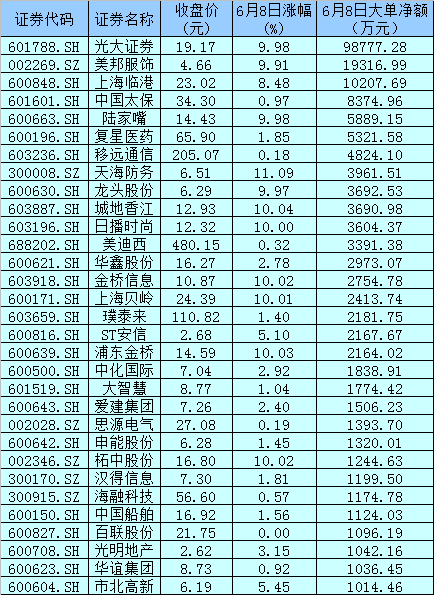 表:6月8日大单资金净流出超1000万元的上海本地股一览