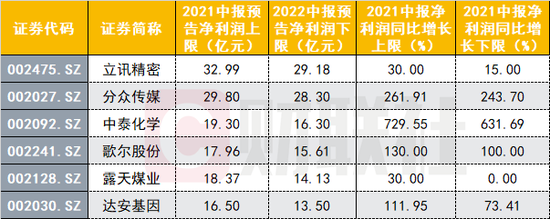 同时,在已公布半年报预告的企业中,立讯精密、分众传媒、中泰化学位列净利润预增前三。此外歌尔股份、露天煤业、达安基因预告半年报净利润下限有望都超过10亿元。