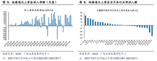 (5)陆港通北上资金流入净额:上周陆股通北上资金净流入29亿元,前一周净流入89亿元。截止2021年6月11日,2021年6月北上资金净流入70亿元,净流入前五名行业是电气设备、银行、交通运输、采掘、化工,净流出行业前五名是食品饮料、医药生物、农林牧渔、建筑材料、房地产。