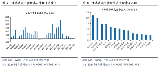 2021年6月(截止6月11日),南下资金净流入28亿元。净买入个股前五为吉利汽车、腾讯控股、中国海洋石油、李宁、药明康德。恒生一级行业净买入前三名为非必需性消费、医疗保健业、能源业,恒生二级行业净买入前三的行业为汽车、药品及生物科技、纺织及服饰。