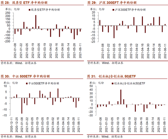 6月7日-6月11日,ETF净赎回,当周净赎回44.6亿份,宽指ETF申赎参半,其中上证50ETF申购较多,中证500ETF赎回较多;行业ETF申赎参半,其中券商ETF申购较多,信息技术ETF赎回较多;具体的,沪深300ETF净申购2.1亿份;创业板ETF净赎回1.2亿份;中证500ETF净赎回2.7亿份;上证50ETF净申购5.5亿份。行业方面,信息技术ETF净赎回22.6亿份;消费ETF净申购1.2亿份;医药ETF净赎回1.5亿份;券商ETF净申购5.7亿份;金融地产ETF净申购0.8亿份;军工ETF净赎回1.7亿份;原材料ETF净申购0.3亿份;新能源&智能汽车ETF净赎回16.2亿份。