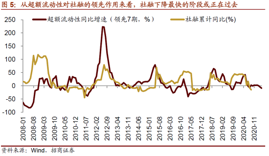 ? 新增社融增速下降最快的阶段或许正在过去。5月社融存量增速继续回落,较前期下降0.7%至11%;新增社融累计同比增速继续下降至-19.33%。从社融结构来看,人民币贷款、非标融资、企业债券均对社融同比构成拖累,企业债和非标收缩,且新增企业债是近三年来首次转负。从不同部门信贷结构来看,居民贷款和企业短贷均同比少增,唯有企业中长期贷款仍处于同比改善的状态(连续15个月同比多增)。另外,从超额流动性对社融的领先作用来看,社融增速下降最快的阶段或许正在过去,未来有望逐渐回归到相对平稳的状态。