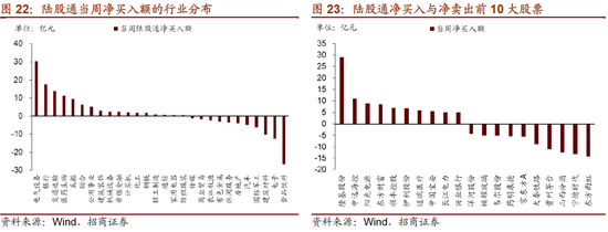 6月7日-6月11日,陆股通资金净流入29.3亿元。行业偏好上,电气设备、银行、交通运输这三个行业净买入规模较高,买入金额分别为30.2亿元、17.5亿元、13.8亿元。净卖出规模较高的行业是食品饮料、电子、建筑材料等行业。个股方面,净买入规模较高的主要包括隆基股份(+29.0亿元)、中远海控(+11.0亿元)、阳光电源(+8.9亿元)等;净卖出规模较高的主要包括东方雨虹(-14.4亿元)、宁德时代(-13.3亿元)、山西汾酒(-12.4亿元)等。