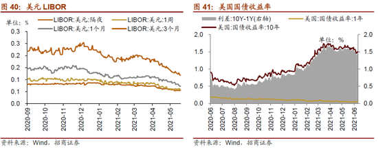6月7日-6月11日,短端美债收益率与前期持平,长端美债收益率下行,利差缩小。美国1年期国债与前期持平,保持在0.05%,10年期国债收益率下行9.0bp至1.47%,利差缩小9.0bp至1.42%,截止6月11日,美元LIBOR以下跌为主,隔夜LIBOR上升0.03bp,1周LIBOR下降0.08bp,1个月LIBOR下降0.84bp,3个月LIBOR下降0.94bp。