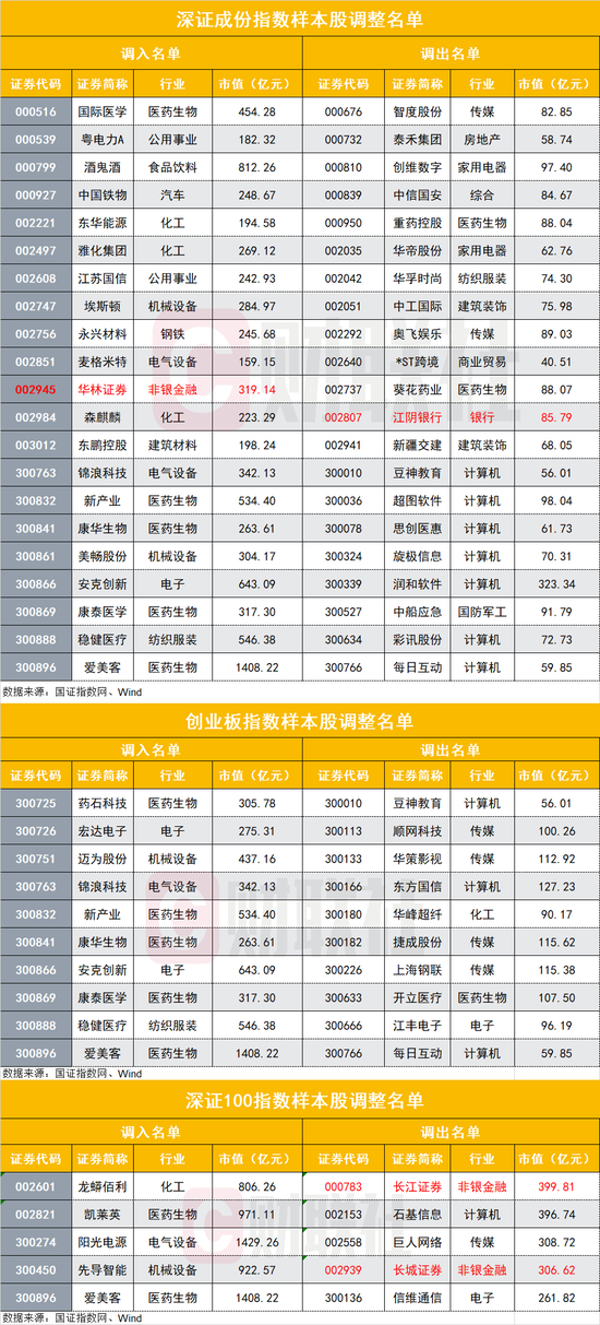 本次调整,深证成指更换了21只样本股,创业板指更换了10只样本股,深证100更换了5只样本股。行业方面,新纳入的成份股涵盖医药生物、公用事业、食品饮料、汽车、化工、机械设备、钢铁、电气设备、非银金融、建筑材料、电子、纺织服装等领域。金融股方面,华林证券被调入深证成指,江阴银行被调出;长江证券和长城证券双双被调出深证100指数成份股。
