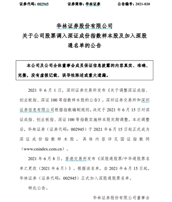 继入选沪深300指数样本股后,华林证券首次被纳入深市核心指数,并成为深港通成份股。当日晚间,华林证券发布公告称,本次调整后,华林证券于2021年6月15日起正式成为深证成份指数样本股,并正式加入深股通股票名单。