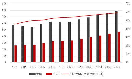 2014-2025全球及中国PCB产值及预测(亿美元)