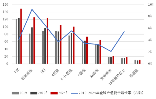 从细分产品结构来看,多层板、FPC及HDI板等产值占比较高,封装基板及FPC增速较高。