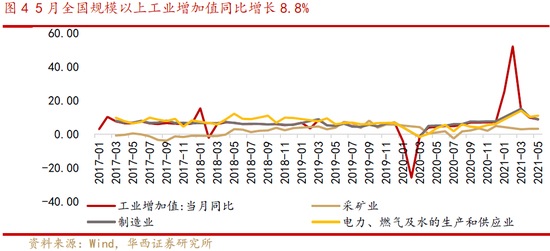 1)工业生产边际放缓。5月工业增加值同比增长8.8%,两年复合增长6.6%,复合增速较4月份回落0.2pct。分门类看,采矿业两年复合增速2.2%,较4月回升0.4pct;制造业两年复合增速7.1%,较4月回落0.5pct;电热燃水生产和供应业两年复合增速7.2%,较4月回升2.1pct;