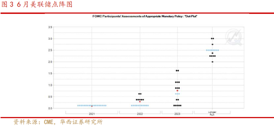 2)点阵图显示多数官员认为将提前加息。超过半数的官员预计2023年会有两次加息,7名官员预计在2022年开始加息,并有2名官员预计2023年将加息6次。而在3月会议中,多数官员预计直到2023年末都将维持近零利率不变;