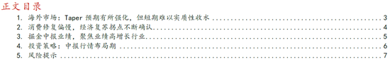 四、投资建议:布局中报行情。海外方面,尽管Taper预期有所强化,但短期美联储实质性缩减购债的可能性较低,同时美债利率曲线趋平也反映了投资者对长期通胀担忧的回落,除非美联储出现超预期的鹰,海外市场流动性仍有望维持相对宽松;国内方面,在经济复苏拐点不断确认,通胀压力有限的背景下,预计货币政策仍将注重有保有控,宽信用格局有望维持。当前国内外宏观流动性仍有利于权益市场表现,若大盘持续回撤,反而是布局中报行情的调仓布局机会。