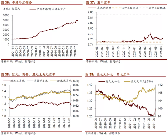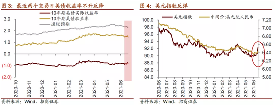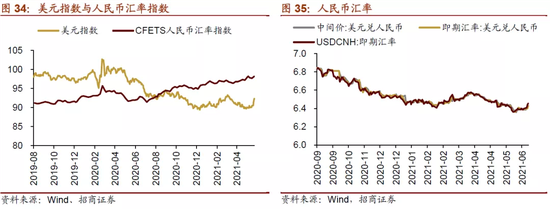 美联储议息会议纪要公布后的两个交易日(6月17日-18日),美债收益率不升反降。从6月16日的1.57%降至6月18日的1.45%。相比之下,在美联储政策收敛预期下,美元指数反弹明显,人民币相对美元小幅贬值。美元指数从6月15日的90.5升至6月18日的92.32;美元兑人民币汇率从6月15日的6.407调贬至6月18日的6.4361。