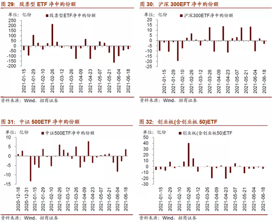 6月14日-6月18日,ETF净赎回,当周净赎回31.9亿份,宽指ETF申赎参半,其中上证50ETF申购较多,创业板(含创业板50)ETF赎回较多;行业ETF申赎参半,其中券商ETF申购较多,信息技术ETF赎回较多;具体的,沪深300ETF净赎回3.0亿份;创业板ETF净赎回3.7亿份;中证500ETF净申购3.6亿份;上证50ETF净申购8.0亿份。行业方面,信息技术ETF净赎回51.7亿份;消费ETF净申购2.2亿份;医药ETF净申购1.1亿份;券商ETF净申购18.7亿份;金融地产ETF净申购2.2亿份;军工ETF净赎回1.1亿份;原材料ETF净赎回1.9亿份;新能源&智能汽车ETF净申购0.2亿份。