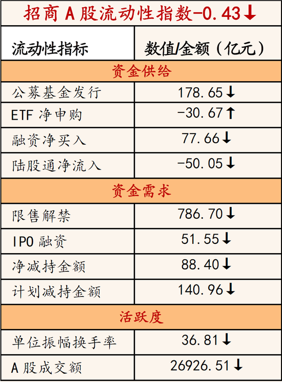 ? 股市方面,A股市场流动性恶化,招商A股流动性指数为-0.43。北上资金流出,净流出50.0亿元;融资余额上升,融资资金净买入77.7亿元;ETF净流出30.7亿元;新成立偏股类公募基金份额减少。重要股东净减持规模缩小,公布的计划减持规模下降。
