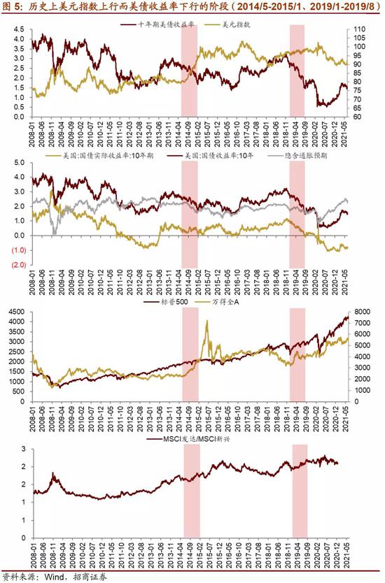 从历史上来看,美元指数走强而美债收益率回落的两个阶段主要包括2014/5-2015/1和2019/1-2019/8。其中,第一个阶段发生在美联储上一轮扩表后Taper实施的过程中,这个阶段美债实际收益率震荡,而隐含通胀预期明显下行,表现为美债名义收益率下行,与当前市场的情况更类似。第二个阶段中,名义收益率下行的主要源于实际收益率下行,即货币政策宽松带来收益率下行。