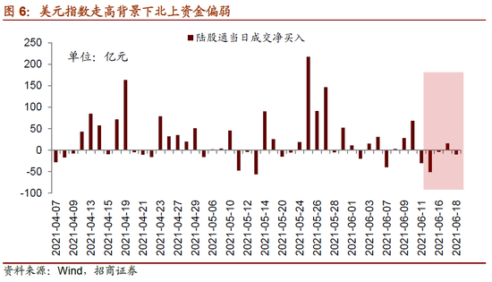从国内市场来看,从6月11日起,北上资金开始明显转弱,6月11日-16日合计净流出86亿元,或主要出于对美联储6月议息会议的担忧。议息会议后,在美元指数走强背景下,北上资金仍延续偏弱的状态。展望未来,美元指数走强阶段,增大北上资金流出可能,从而影响A股市场微观流动性。